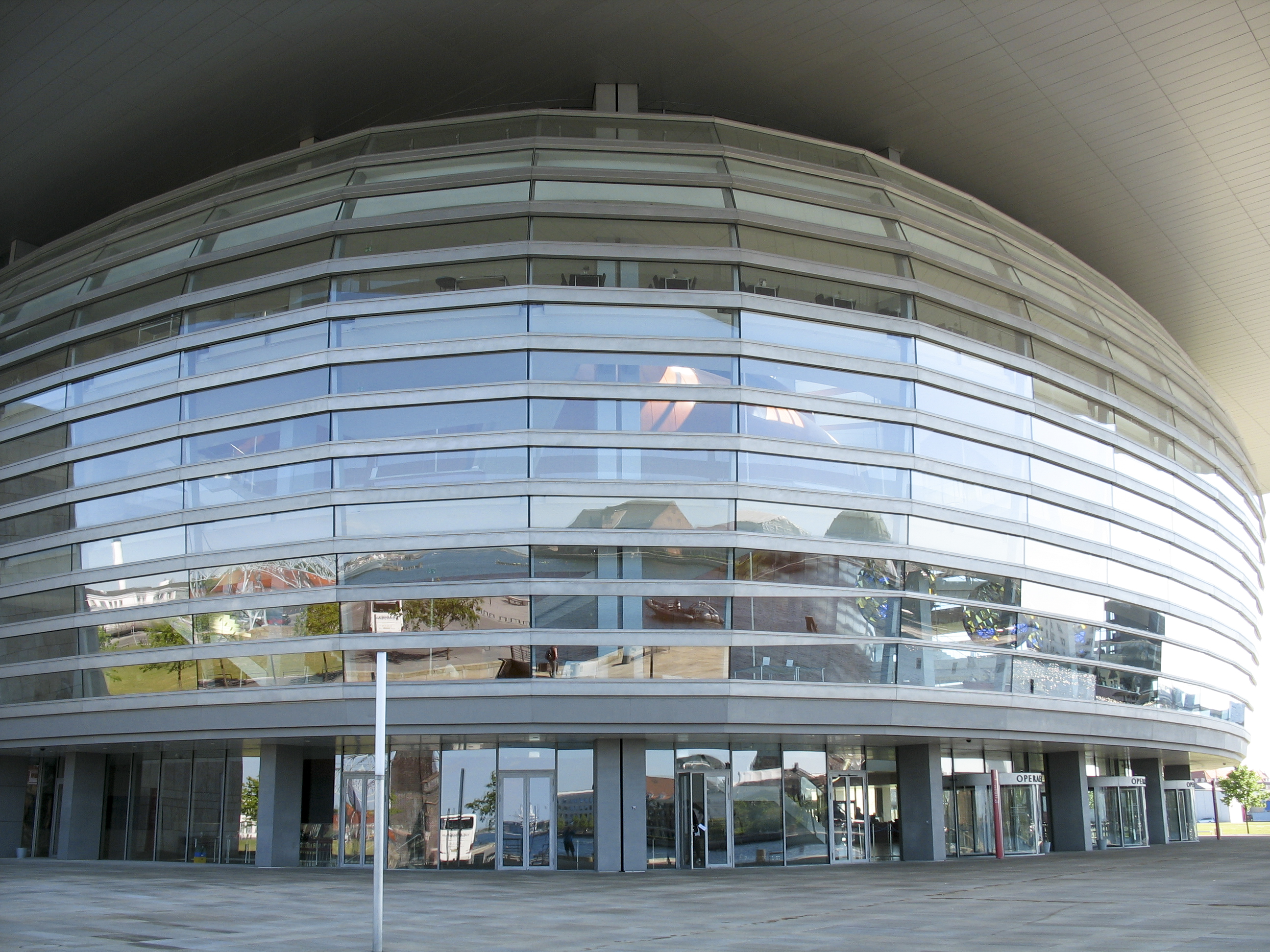 건물 외관은 독일에서 채석된 베이지색 석회암인 쥐라 겔브(Jura Gelb)로 마감되었다. 이 건물은 구조물이 섬에 있는 듯한 인상을 주기 위해 설계된 운하로 둘러싸인 부지에 위치해 있다. 건물에 접근하기 위해 건설된 다리는 19세기 초 국가 해군 함대를 대체하기 위해 심어진 참나무로 만들어졌으며, 이 함대는 1807년 9월 코펜하겐 폭격으로 손실되었다. 건물의 전면은 원래 항구 쪽에서 강당의 껍데기를 볼 수 있도록 큰 유리 패널로 설계되었다. 그러나 머스크는 유리가 노화에 취약하다는 점을 강조하여 파사드를 금속 격자로 변경했다.[14] 건물의 전면 파사드는 오스트리아 파사드 전문가 바그너-비로가 설계하고 건설했다.[15]