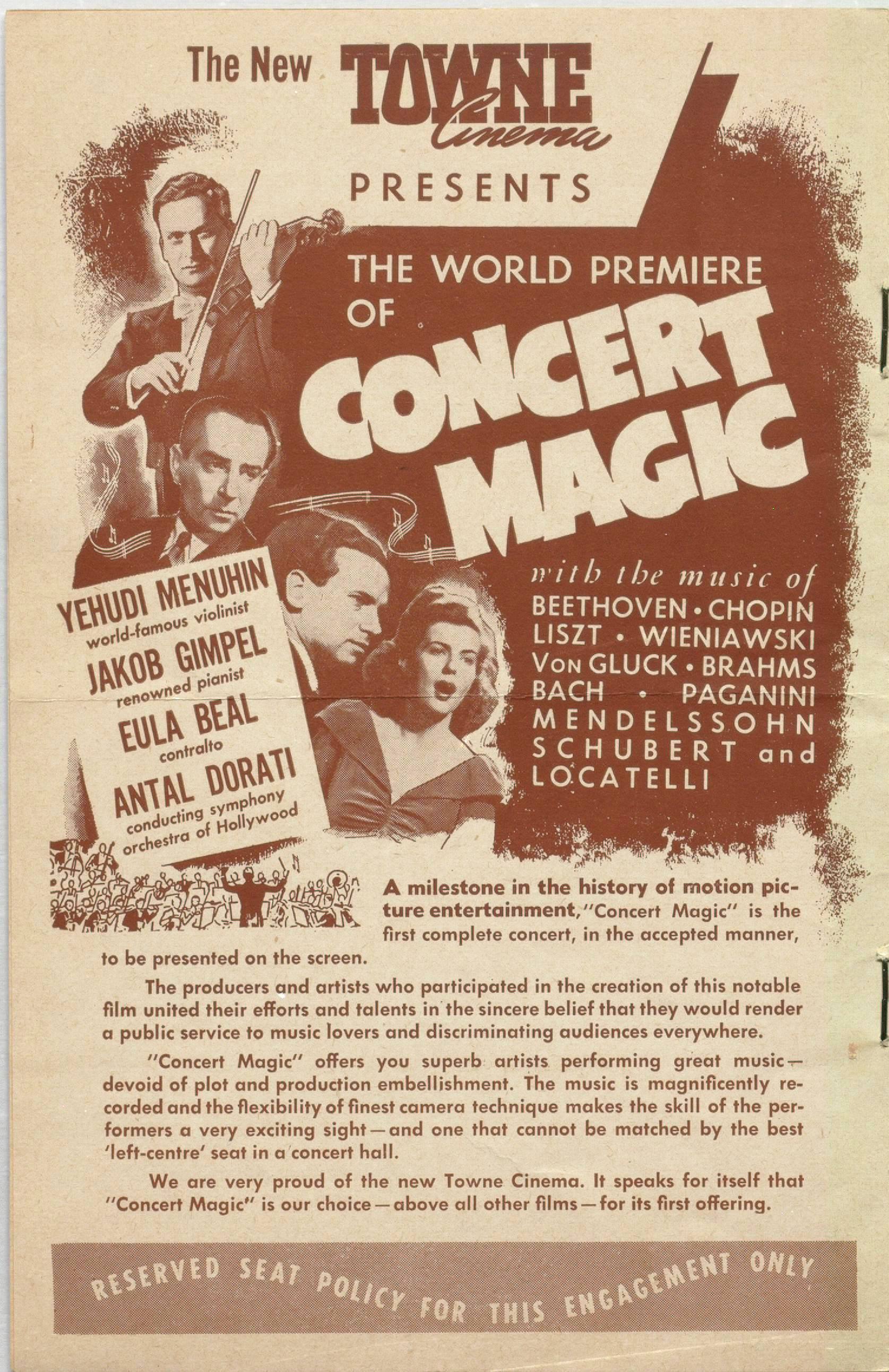 가장 초창기 콘서트 영화 중 하나는 1944년 영화 음악의 모험이다.[4] 또 다른 초기 영화는 1948년 작품 ''콘서트 매직''이다. 이 콘서트에는 1947년 찰리 채플린 스튜디오에서 예후디 메뉴인(1916–1999)이 출연했다. 그는 베토벤, 비에니아프스키, 바흐, 파가니니 등 유명 작곡가들의 클래식 및 낭만주의 작품을 다양한 아티스트들과 함께 연주했다.[5]