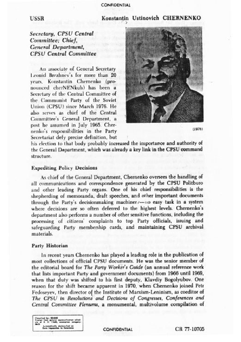 콘스탄틴 체르넨코는 1911년 러시아에서 태어나 소련 공산당에서 경력을 쌓았다. 레오니트 브레즈네프의 측근으로 활동하며 소련 공산당 중앙위원회 총무부장을 역임했고, 1984년 유리 안드로포프의 사망 이후 소련 공산당 서기장에 선출되었다. 그는 브레즈네프 시대의 정책으로 복귀하려 했지만, 건강 악화로 인해 재임 기간 동안 소련의 외교 정책에 큰 영향을 미치지 못했다. 1985년 사망했으며, 크렘린 성벽 묘지에 매장되었다.
