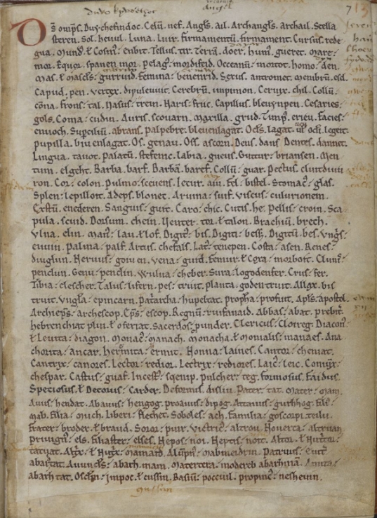 이 시대의 다른 자료로는 약 50명의 콘월 성인 목록인 '성인 목록',[35] 해방자와 노예(대부분 콘월식 이름)의 목록인 보드민 해방 문서,[36] 그리고 중요한 자료인 라틴어-콘월어 어휘집(Vocabularium Cornicumla 또는 코토니안 어휘집)이 있다. 이 어휘집은 앨프릭의 라틴어-고대 영어 어휘집을 콘월어로 번역한 것이다.[37] 이 어휘집은 창세기 창조 이야기, 해부학, 교회 계층, 가족, 다양한 장인과 도구, 식물, 동물, 가정용품 등 여러 주제로 구성되어 있다.[38][39] 이 사본은 18세기 에드워드 류이드가 콘월어로 확인하기 전까지는 고대 웨일스어로 여겨졌다.