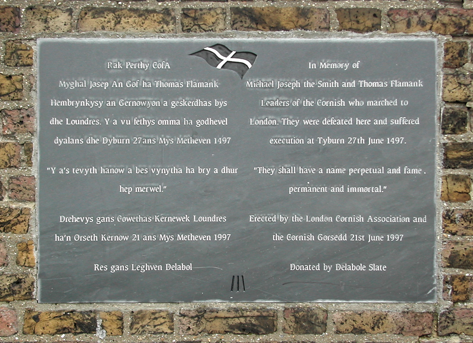 중세 콘월어 표기법은 상당한 변이를 보이며, 중세 영어 철자법의 영향을 받았다.[100] 요크(Ȝ ȝ)는 특정 중세 콘월어 텍스트에서 사용되는데, 치경 마찰음 /θ/와 /ð/를 포함한 다양한 음가를 나타내는 데 사용되며, 이는 중세 콘월어에만 고유한 용법으로 중세 영어에서는 결코 발견되지 않는다.[101] 중세 콘월어 필사가들은 후치 모음 앞에서는 ⟨c⟩를 /k/로, 전치 모음 앞에서는 ⟨k⟩를 /k/로 사용하는 경향이 있지만, 항상 그런 것은 아니며, 특정 텍스트에서는 이 규칙이 일관성이 떨어진다. 중세 콘월어 필사가들은 중세 영어와 마찬가지로 /ʍ/(또는 /hw/)를 나타내는 데 거의 보편적으로 ⟨wh⟩를 사용한다. 중세 콘월어, 특히 이 시대 말기에 접어들면서 강세를 받는 단음절 어말 위치에서 고대 브리토닉어 /ɡ/와 /b/의 반영을 나타내기 위해 각각 ⟨g⟩와 ⟨b⟩를, 무강세를 받는 어말 음절에서 ⟨k⟩와 ⟨p⟩를 사용하는 경향이 있다.[102]6. 3. 근대 콘월어 표기법
