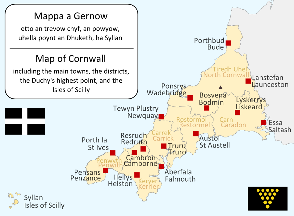 2002년, 콘월어는 영국 정부에 의해 유럽 지역 또는 소수 언어 헌장 제2부에 따라 공식적으로 인정받았다. 유네스코 세계 언어 아틀라스는 콘월어를 "심각한 멸종 위기" 언어로 분류하며, 이전에 사용했던 '멸종' 분류는 더 이상 정확하지 않다고 밝혔다.[14]
