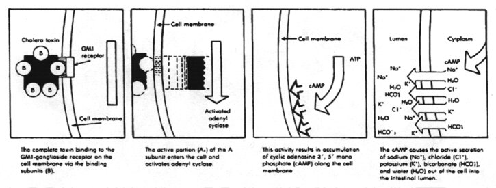 A1 서브유닛은 니코틴아미드 아데닌 디뉴클레오티드(NAD)를 분해하여 ADP 리보스를 G 단백질의 일종인 Gs 단백질에 결합시킨다. ADP 리보실화된 Gs 단백질은 GTP 분해가 억제되어 항상 활성화된 상태가 되고, 아데닐산 사이클레이스를 계속 활성화시켜 세포 내 사이클릭 AMP(cAMP) 농도를 상승시킨다. cAMP 농도 상승은 이온 채널을 열어 세포 내에서 물과 전해질이 계속 누출되게 한다. 이로 인해 쌀뜨물 같은 흰색 수양성 설사를 일으키고 탈수 증상과 전해질 대사 이상에 의한 산증을 일으킨다.[62][66]