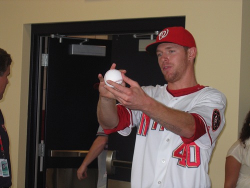 2008년 워싱턴 내셔널스에 입단했다. 6월 30일 내셔널스로 콜업되었고,[22] 다음 날 플로리다 말린스를 상대로 메이저 리그 데뷔전을 치렀다. 5이닝 동안 3개의 삼진을 잡고 1안타만을 허용하며, 내셔널스의 9-6 승리에 기여했다. 이 승리로 1999년 댄 스미스 이후 데뷔전에서 승리한 최초의 내셔널스 선발 투수가 되었는데, 당시 팀은 아직 몬트리올에서 활동하고 있었다.[23] 이후 내셔널스에서 14경기에 더 선발 등판하여 3승 7패, 평균자책점 5.51을 기록했다.[24]