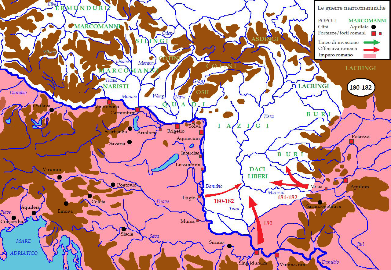 마르쿠스 아우렐리우스의 사망 후, 콤모두스는 도나우강 군단의 총사령관으로 잠시 전선에 머물면서 마르코만니 전쟁을 끝내기 위한 강화를 모색했다. 반년 가까운 협상 끝에 야만족과 도나우강 연안에서의 영토선을 확정하고 전쟁을 종결시켰다. 강화 내용은 포로가 된 군단 병사의 반환과 공물의 지불(도중에 면제됨), 그리고 마르코만니족과 동맹을 맺고 있던 콰디족이 총 1만 3000명의 동맹군을 제공하는 것이었다.[54] 또한 양 부족은 로마 제국군의 감독하에 놓였으며, 주변 부족과의 전쟁도 반드시 황제의 재가를 받도록 했다.[55]