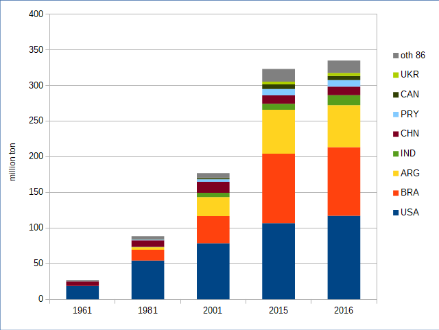 콩기름은 팜유 다음으로 대표적인 식용유이며, 콩 수요의 87%를 차지한다. 주요 생산국은 중국, 미국, 브라질, 아르헨티나 등이다. 대두박은 간장 원료나 가축 사료로 이용되며, 최근에는 밀가루 대체 식품으로도 판매된다. 콩기름 부산물인 대두레시틴은 화장품이나 식품 유화제로 사용된다.[254][255] 사료로는 주로 대두박이 이용되며, 양질의 단백질 공급원으로 육우 비육이나 조류 산란율 향상에 기여한다. BSE 문제로 육골분 이용이 규제되면서, 이를 대체할 단백질 공급원으로 콩 수요가 증가했다.[295]