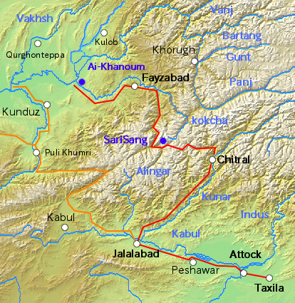 고대 인더스 문명은 메소포타미아-하라파 길을 통해 금 등의 귀금속과 목재를 메소포타미아 문명으로 수출했다.[54] 간다라의 수도는 파키스탄의 탁실라에 있었고, 자랄라바드에서 쿠나르 강 연안의 계곡을 따라 치트랄까지 올라가 바다흐샨 주의 콕차 강에 이르러, 강 연안의 계곡을 따라 내려가 타하르 주에 들어가 판지강에 도달하는 고대 도로는 힌두쿠시 산맥을 넘어 아무다리야강에 이르는 중요한 간선도로 중 하나였다.[55]