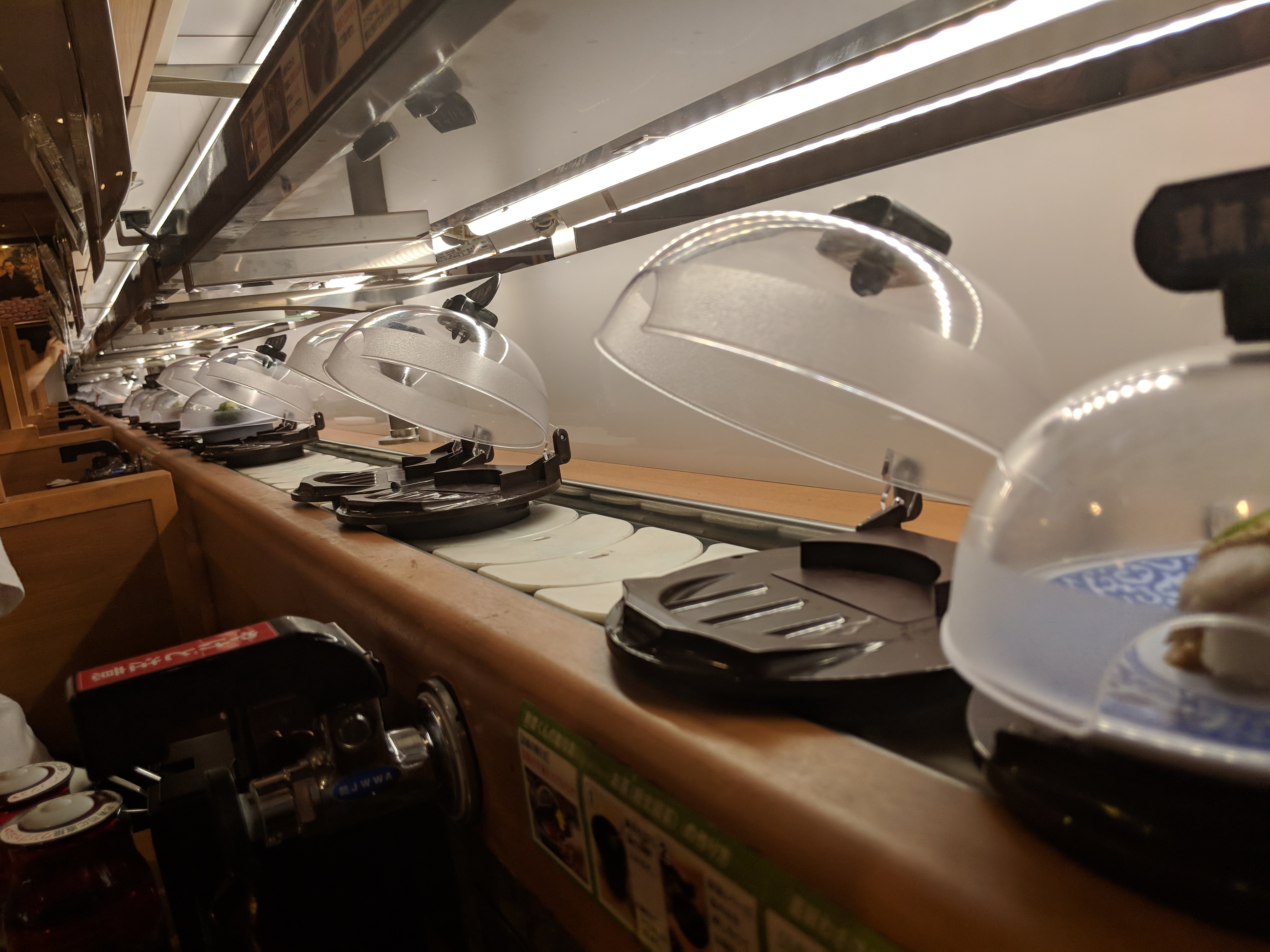 직선형 레인과 터치스크린식 주문 시스템을 갖추고 있다. 손님이 접시를 투입구에 넣으면 자동으로 회수되어 설거지장으로 이동하고, 동시에 접시 개수가 계산된다. 2000년에는 접시 계산 회수 시스템과 연동된 게임 추첨기 '빗쿠라폰! (ビッくらポン!)'을 도입했다.[27] 5접시를 투입할 때마다 게임이 시작되고, 당첨되면 캡슐 경품을 받을 수 있다.