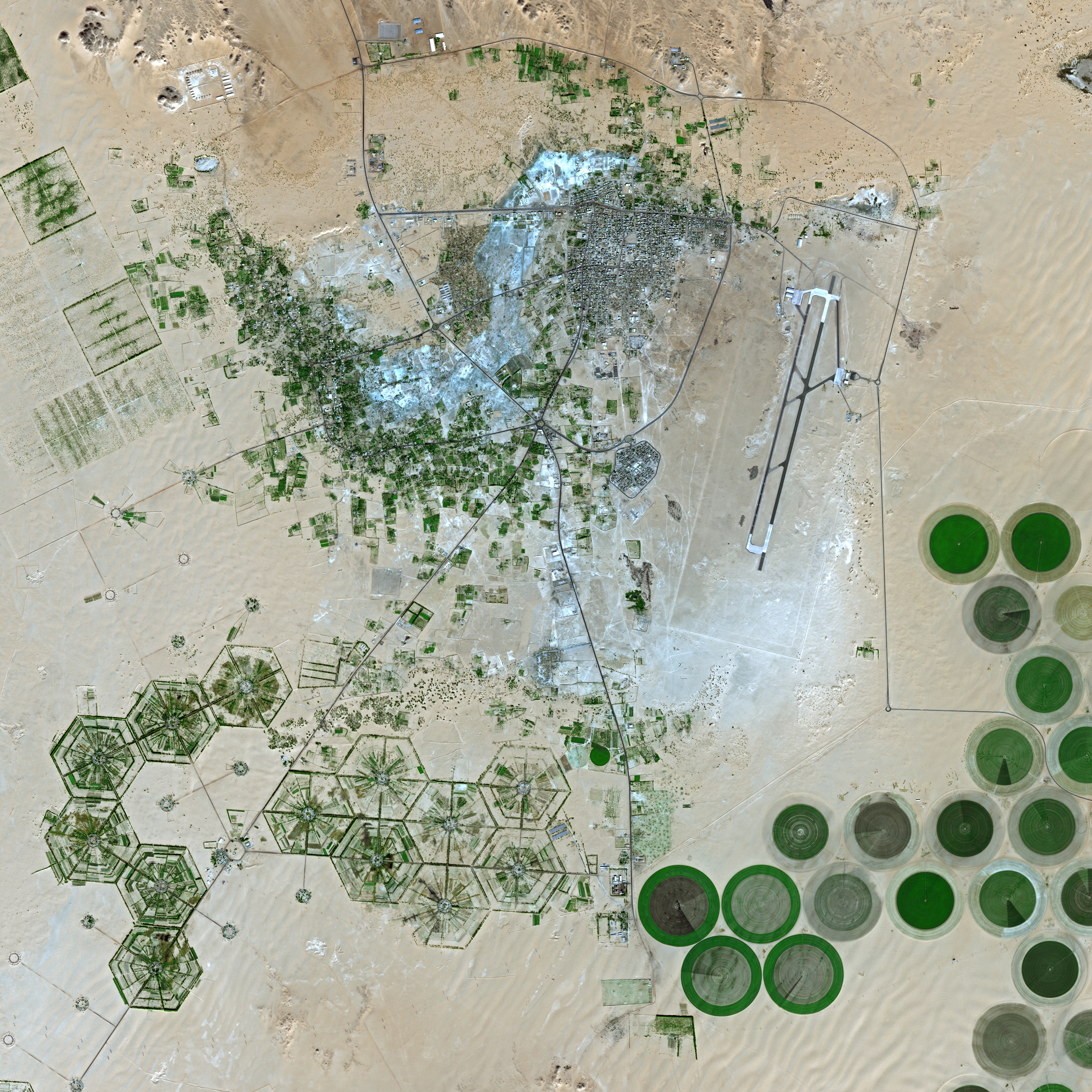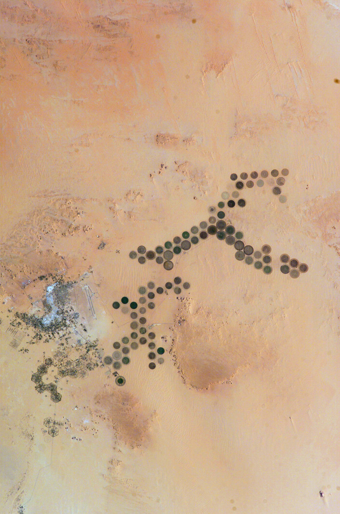 이것은 리비아에서 가장 큰 농업 프로젝트 중 하나이다. 리비아 땅의 약 2%만이 경작에 충분한 강우량을 받기 때문에 이 프로젝트는 지하 대수층을 이용한다. 사막의 녹색 원형들은 종종 중앙 피벗 관개에 의해 지원되는 농업 지역을 나타낸다. 이 농업 프로젝트는 국제 우주 정거장에 탑승한 우주비행사들에게 쉽게 식별 가능한 랜드마크이다.[21] 리비아 정부는 또한 증가하는 인구와 산업 발전을 지원하기 위해 이 지하수 매장량을 해안으로 펌핑하고 수송하는 인공 대수로 프로젝트를 가지고 있다. 2011년 12월 현재, 대수층의 과도한 개발로 오아시스의 호수가 완전히 고갈되었다.[22]