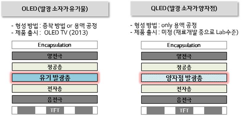 양쪽 전극에서 주입된 전자(Electron)와 정공(Hole)이 양자점 발광층에서 만나 여기자(Exciton)를 형성하고 여기자의 발광재결합을 통해 빛을 내는 구조이다.[85] QLED의 양자점은 열과 수분에 취약하여 자발광 OLED와 같은 증착 방식이 불가능하므로 잉크젯 프린팅 방식의 개발이 필요하다.