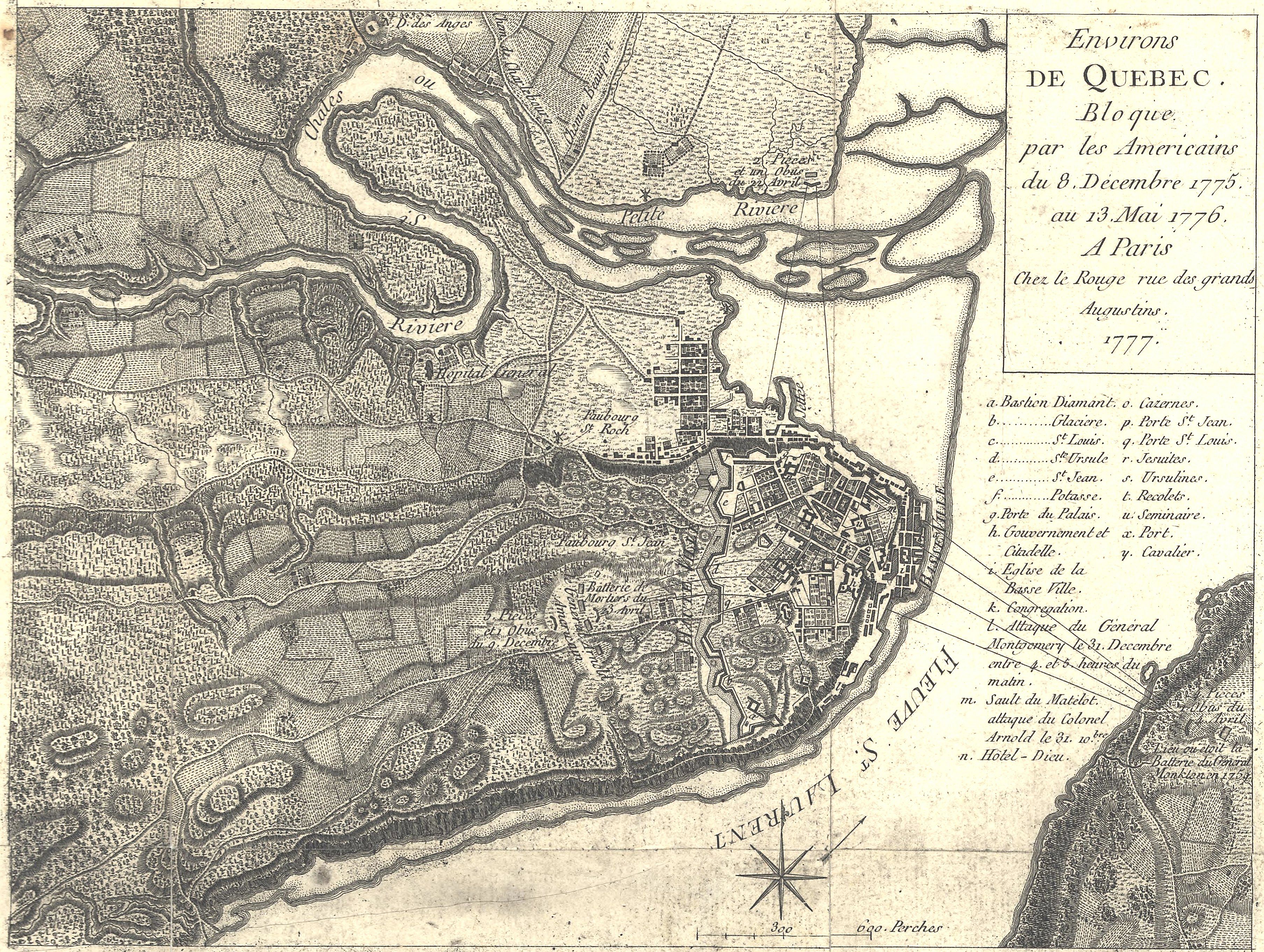 4월 초, 아놀드는 데이비드 우스터 장군으로 교체되었고, 그는 다시 4월 말에 존 토머스 장군으로 교체되었다.[165] 칼턴 총독은 수적 우위에도 불구하고 퀘벡 성벽 안에서 방어적인 자세를 유지했다.[166] 그는 1759년 퀘벡 포위전 당시 제임스 울프 휘하에서 복무했던 경험을 통해, 성 밖으로 나서는 것이 위험하다는 것을 알고 있었다.