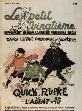1930년 1월 23일, 르 프티 방티엠|Le Petit Vingtième프랑스어("작은 20세기")에 《퀵과 플뤼프케》가 처음 등장했다. 초기에는 플뤼프케 없이 퀵만 등장했는데, 퀵은 그 호의 표지에서 자신을 브뤼셀에서 온 꼬마라고 소개하며 매주 목요일마다 지난 한 주 동안 일어난 일을 이야기해 주겠다고 말했다. 퀵의 이름은 에르제의 친구에게서 따왔다. 3주 후, 플람스어로 "작은 필립"이라는 뜻의 플뤼프케가 등장했다. 이후 6년 동안 《퀵과 플뤼프케》는 매주 목요일 르 프티 방티엠프랑스어에 게재되었다.