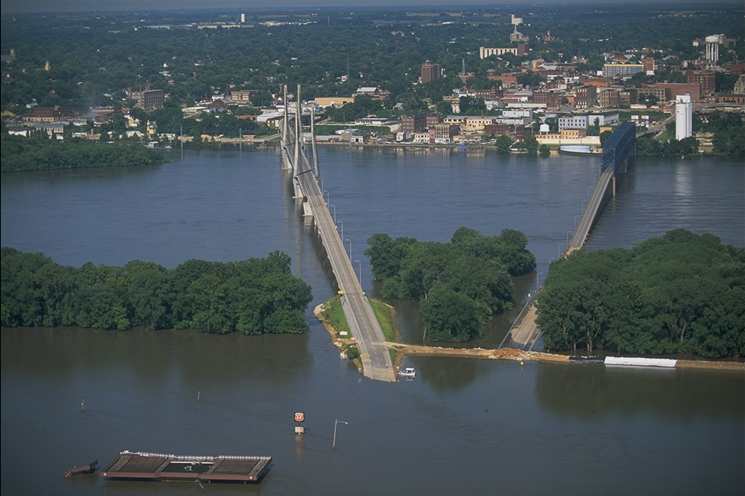 1993년 미시시피 강 대홍수 동안 강이 홍수위보다 약 4.57m 높은 약 9.81m까지 치솟으면서 강변 사업체와 산업체가 큰 피해를 입었다. 한때 퀸시의 두 다리 중 하나인 베이뷰 다리는 일리노이주 얼턴(Alton, Illinois)과 아이오와주 버링턴(Burlington, Iowa) 사이의 미시시피 강을 가로지르는 유일하게 열린 다리였다. 퀸시 기념 다리는 서쪽 접근로에 물이 차면서 6월 말부터 폐쇄되었다. 1993년 7월 16일, 미주리주 테일러(Taylor, Missouri)의 미시시피 강 서쪽에 있는 땅이 물에 잠기면서 베이뷰 다리가 폐쇄되었고, 퀸시의 다리는 73일 후인 1993년 9월 26일에 다시 개통되었다.[31]