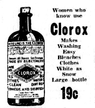1913년 5월 3일, 캘리포니아주 오클랜드에서 5명의 투자자가 '''일렉트로-알칼라인사(Electro-Alkaline Company)'''[10]를 설립하면서 미국 최초로 상업용 액체 표백제 생산이 시작되었다. 이들은 샌프란시스코 만 동쪽에 공장을 설립했고,[10] '클로록스(Clorox)'라는 브랜드명은 주성분인 염소와 수산화 나트륨의 혼성어이다.
