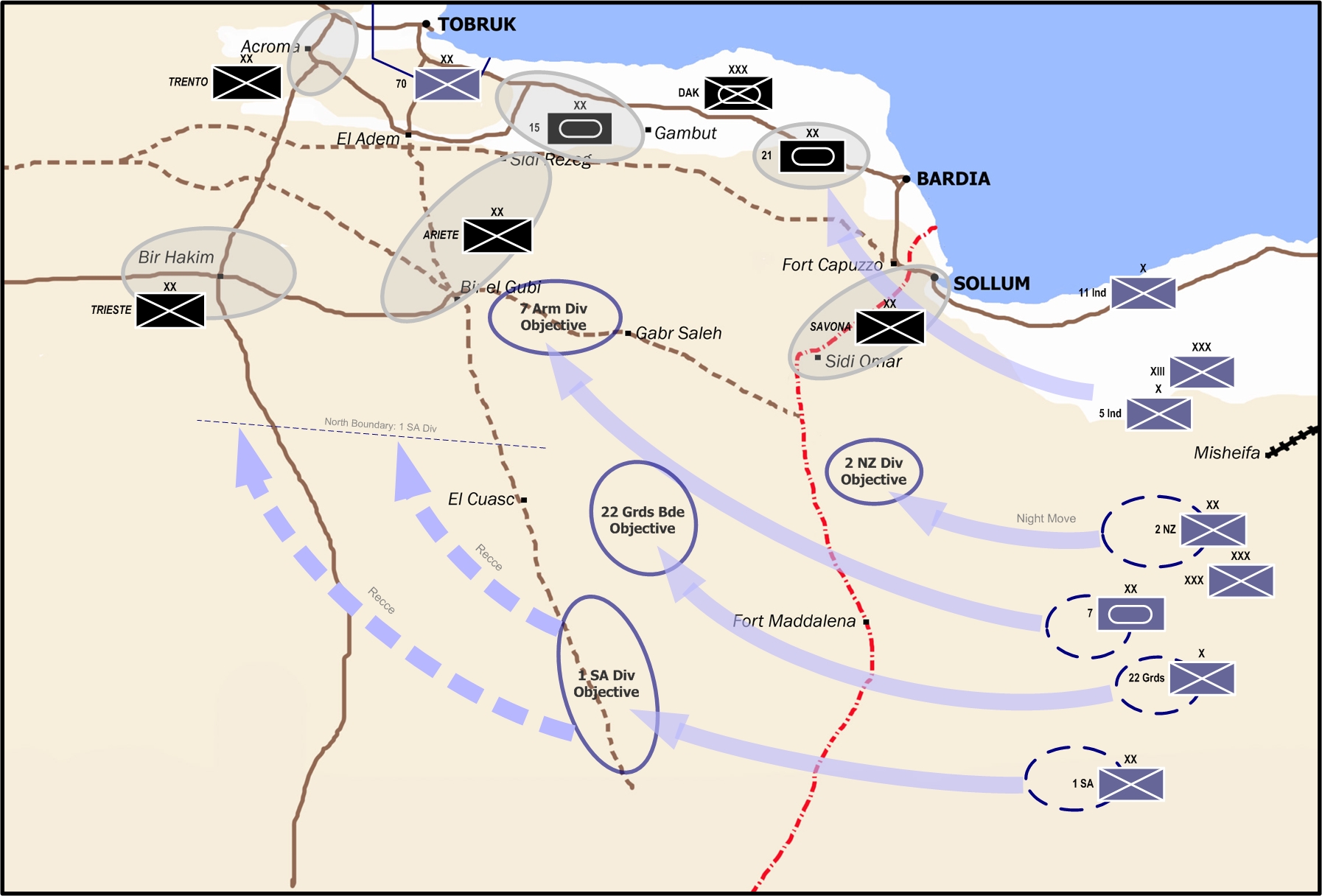 전체적으로 제13, 30군단은 이집트-리비아 국경 부근에서 토브룩까지 추축국군을 포위하고, 토브룩 수비대도 안쪽에서 호응하여 공격, 섬멸하는 계획이었다.[44][45]