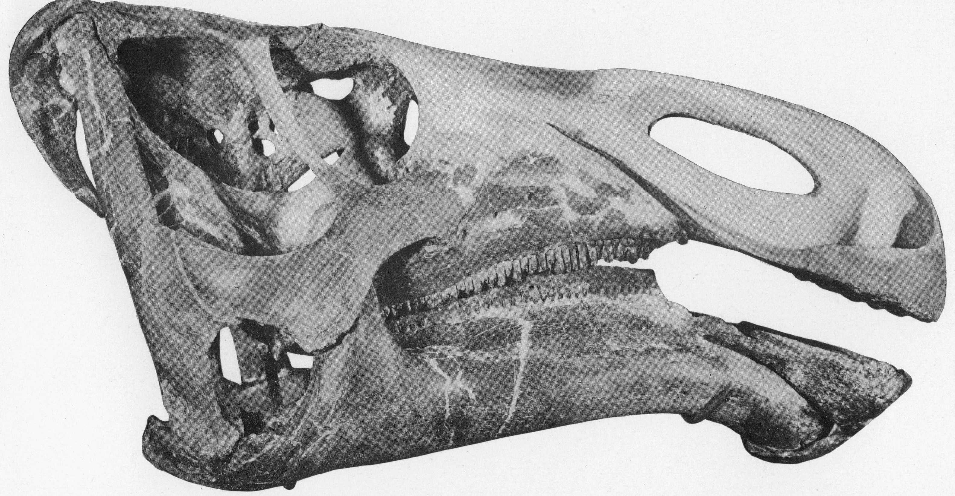 두개골의 길이는 위 부리 끝에서 두개골 뒤쪽에서 아래턱과 연결되는 사각골 기저부까지 87cm로 추정된다.[32] 원래 ''아나사지사우루스''(Anasazisaurus)로 분류되었던 두개골을 바탕으로, 완전한 볏의 형태는 코뼈에서 시작하여 눈 사이와 위로 솟아오르고 그 아래로 접혀 들어가는 뼈의 탭 또는 플랜지 형태이다. 이러한 독특한 볏은 ''그리포사우루스''(Gryposaurus)와 같은 유사한 하드로사우루스류와 구별할 수 있게 해준다.[33] 볏의 상단은 거칠고 두개골의 최대 보존 길이는 90cm에 이를 수 있다.[24]