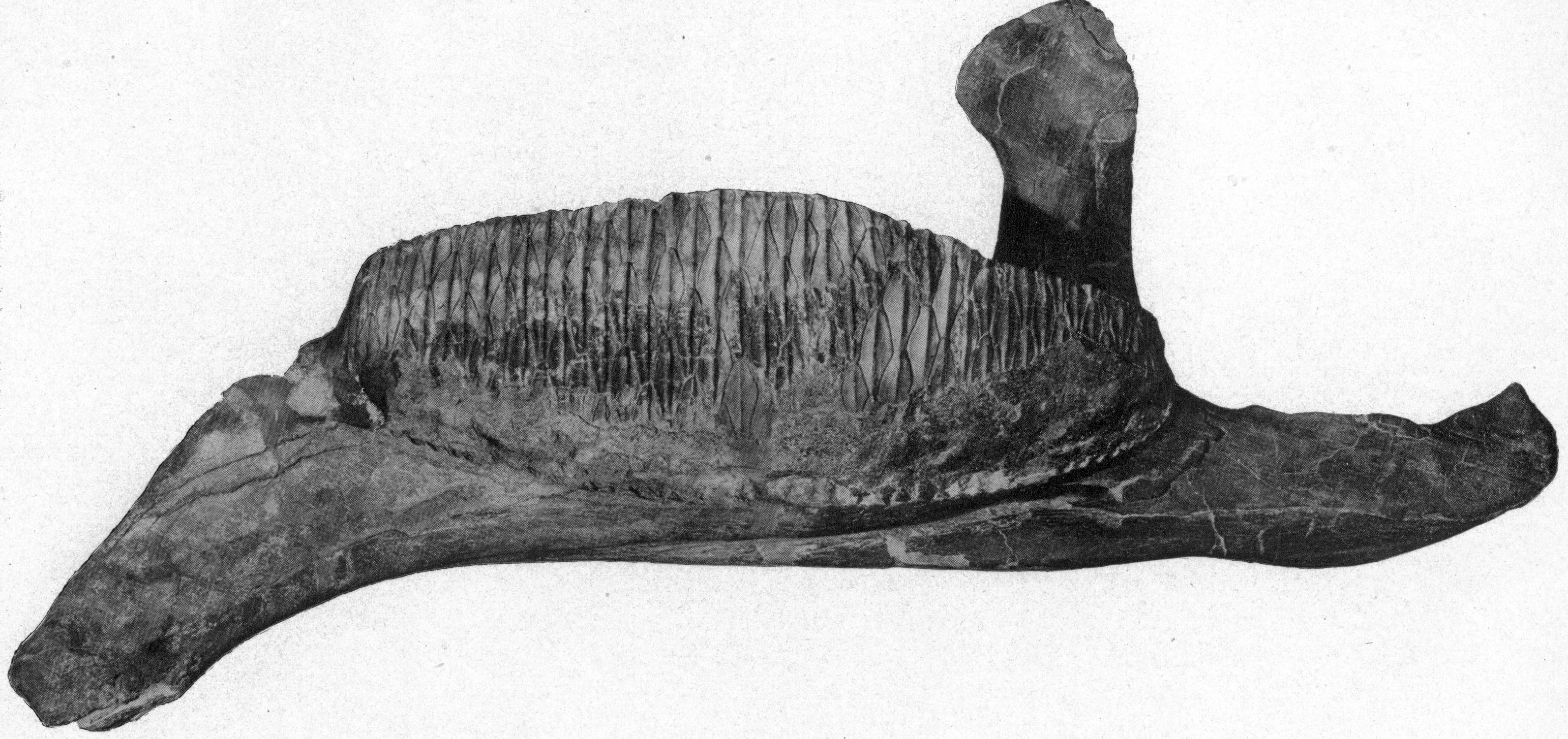 - 초기 명명과 재구성: 브라운은 처음에 이 화석을 넥토사우루스(Nectosaurus)라고 명명하려 했으나, 이미 다른 동물에 사용된 이름이었기 때문에 크리토사우루스 나바조비우스(Kritosaurus navajovius)로 변경했다.[63] 그는 발견 당시 두개골 앞부분이 손상되어 에드몬토사우루스와 유사하게 복원했지만, 나중에 그리포사우루스와 비슷한 아치형 비골(nasal bone) 볏을 가진 형태로 수정했다.[62]