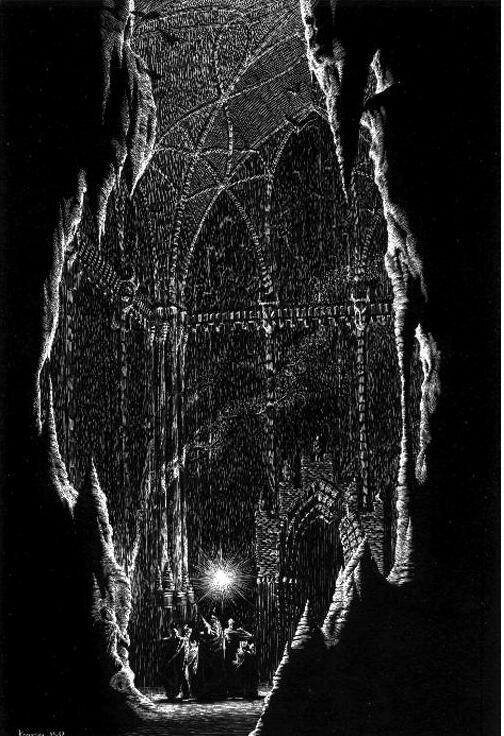 동굴은 지하 심연인 검은 구렁텅이(Black Chasm)로 이어졌는데, 너비가 약 15미터였고 깊이는 알 수 없었으며, "난간이나 턱이 없는 가느다란 돌 다리"인 두린의 다리(Durin's Bridge)를 통해서만 건널 수 있었다.[3] 다리를 건너려는 모든 그룹은 일렬로 가야 했고, 이는 공격의 위력을 제한했다.[5]
