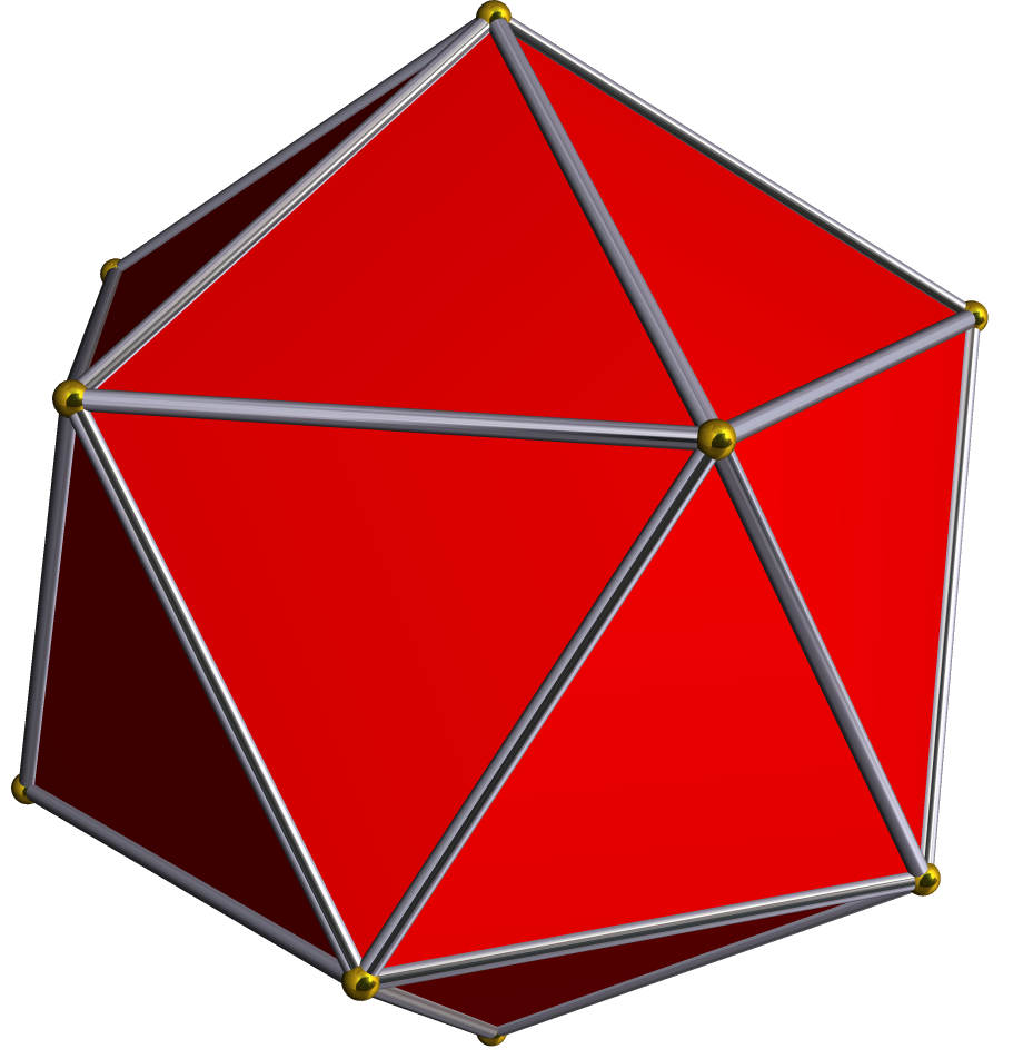 큰 이십면체는 삼각형을 두 가지로 색칠할 수 있고 황철면체 대칭으로 구성될 수 있으며, '역다듬은 정팔면체'라고 부른다.[2]정사면체 대칭 | 황철면체 대칭 |