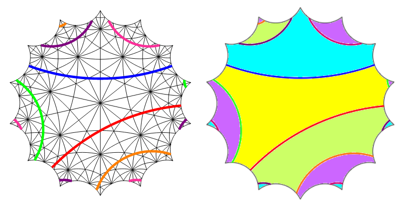 - 데생당팡: 쌍곡 평면을 정7각형으로 덮는 방식으로 데생당팡을 구성할 수 있다.