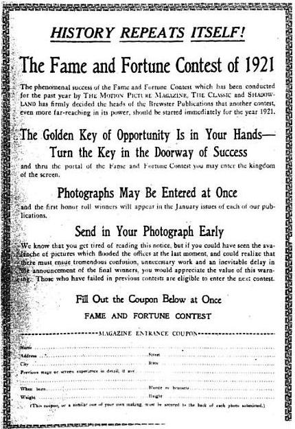 1921년, 클라라 보는 브루스터 출판사의 잡지 "명성과 행운" 콘테스트에서 우승하며 영화계에 발을 들여놓게 되었다.[15] 심사위원들은 보의 자신감, 결단력, 야망을 높이 평가하며, 감정 표현 범위와 스크린 장악력을 극찬했다.[16]