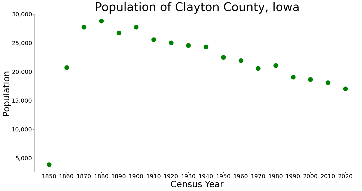 클레이턴군의 인구는 미국 인구 조사를 통해 주기적으로 집계되고 있다. 1850년 첫 조사 이후 인구가 기록되었으며, 1880년에 28,829명으로 최대치를 기록한 후 점진적인 감소 추세를 보이고 있다. 자세한 연도별 인구 변화 및 통계 정보는 아래 하위 섹션에서 확인할 수 있다.