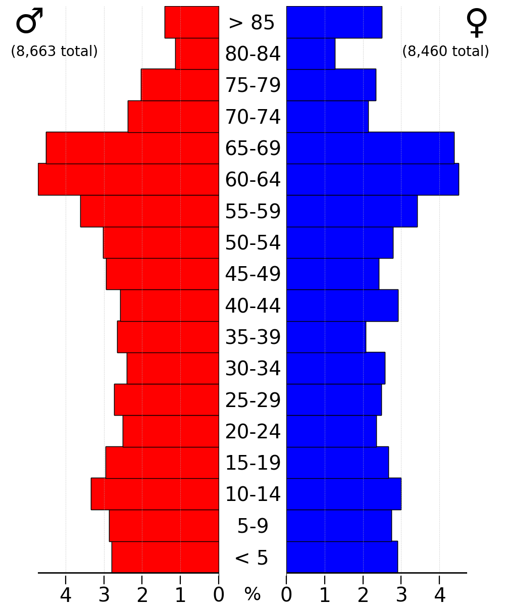 이 군의 주민 중 25.40%는 18세 미만 미성년자, 18세 이상 24세 이하는 6.50%, 25세 이상 44세 이하는 26.00%, 45세 이상 64세 이하는 23.60%, 65세 이상은 18.50%이다. 중앙값 연령은 40세이다. 여성 100명당 남성은 97.60명이다. 18세 이상 여성 100명당 남성은 95.50명이다.