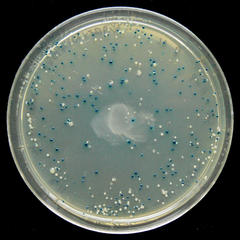 LB 한천 배지에 나타난 파란색-흰색 스크리닝 결과. 흰색 콜로니는 운반하는 플라스미드에 삽입물이 포함되어 있을 수 있으며, 파란색 콜로니는 클로닝에 실패한 경우이다.