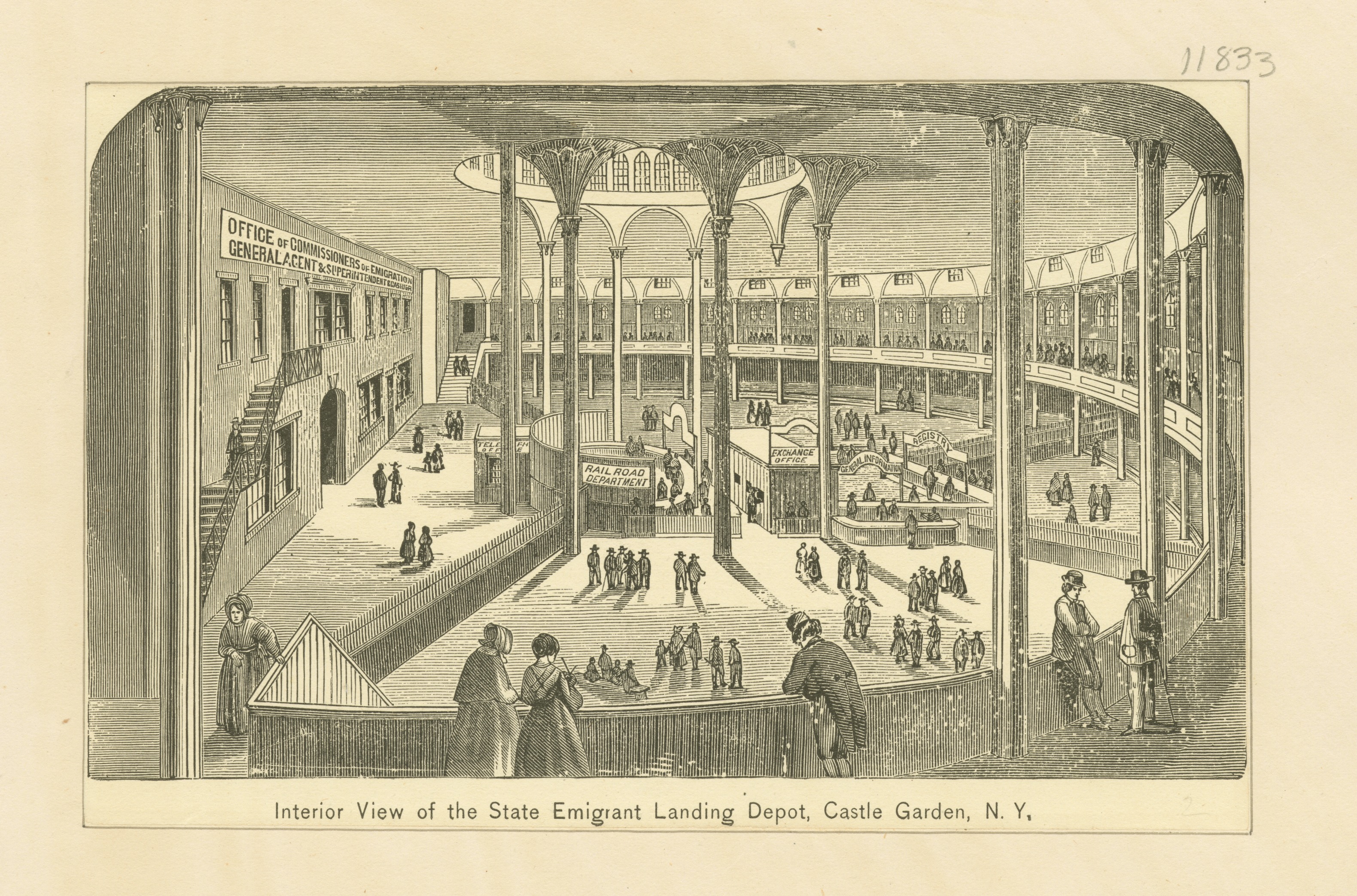 캐슬 가든은 1855년 8월 1일부터 1890년 4월 18일까지 미국의 최초 이민 등록소 역할을 했다.[31][46][310] 이민 등록소는 대기실 주위에 배치된 사각형 책상과 정문 양쪽에 있는 화장실로 구성되었으며,[51][52] 2,000명에서 4,000명 사이를 수용할 수 있는 나무 벤치도 있었다.[53] 뉴욕 센트럴 철도와 뉴욕 및 이리 철도는 캐슬 가든에서 기차표를 판매했다.[56][58]
