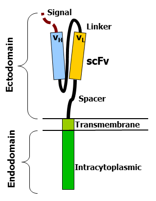 항체의 가변 부위는 중쇄 및 경쇄로 구성되며, 두 개의 항원 인식 부위를 갖는다. 키메라 항원 수용체에서는 유연한 링커에 의해 중쇄 가변 부위 VH와 경쇄 가변 부위 VL이 결합하여 단일 사슬 가변 부위 단편(scFv)을 형성한다. 막 횡단 도메인은 전형적인 소수성의 α-나선 단백질이다. I형 단백질은 두 개의 단백질 도메인이 막 횡단 α-나선 단백질에 의해 연결되어 있고 세포막의 지질 이중층을 막 횡단 도메인이 관통하며, 세포막이 세포 내부와 세포 외부를 나눈다.