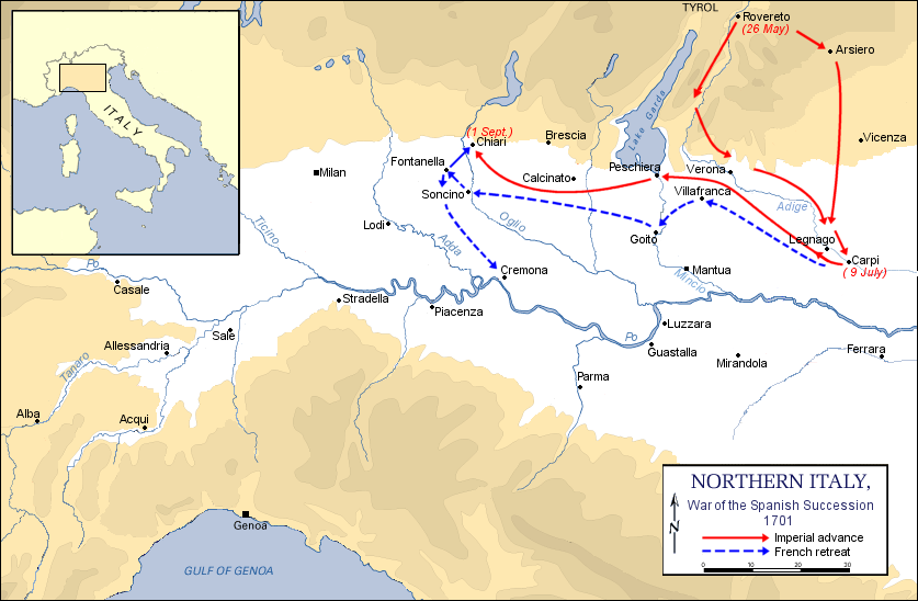 1701년, 스페인 왕위 계승 전쟁이 발발하면서 유럽의 주요 강대국들이 갈등에 휘말렸다. 프랑스의 루이 14세는 자신의 손자인 펠리페 5세를 스페인 왕위에 앉히고자 했고, 이에 맞서 오스트리아 합스부르크 가문은 스페인 왕위 계승권을 주장하며 대립했다. 이탈리아는 양측의 주요 격전지 중 하나였다.