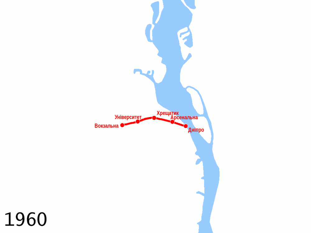 1960년 11월 6일, 10월 혁명 기념일에 보크잘나-드니프로 구간(현재 스뱌토신스코-브로바르스카 선) 5.24km이 개통되었다.[12] 이반 비노그라도프가 키이우 지하철의 첫 번째 기관사로 여겨진다.[13][14]