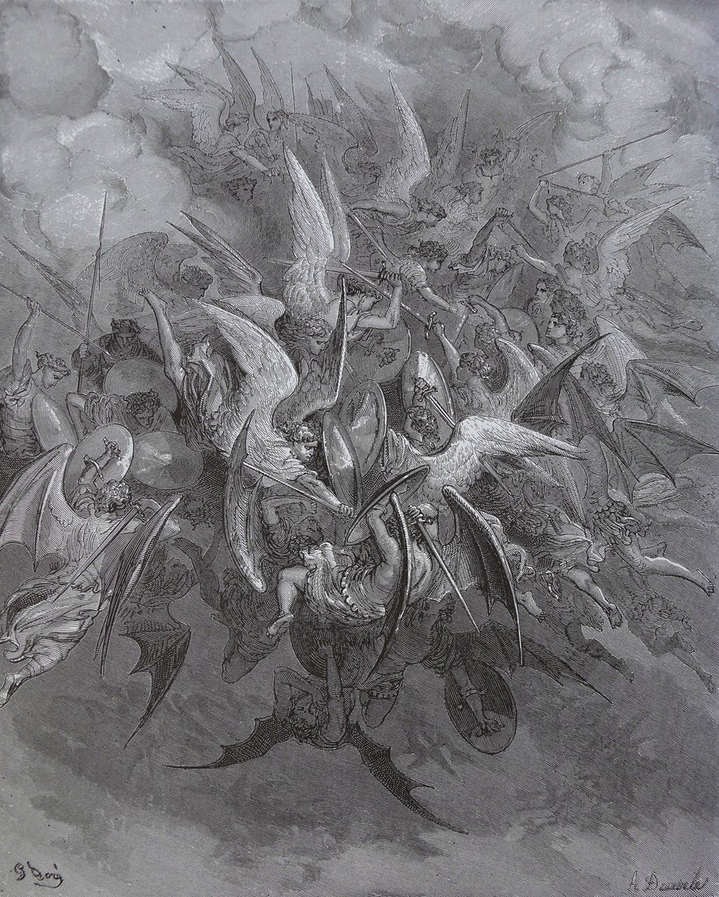 존 밀턴의 17세기 서사시 ''실낙원''에서 순종적인 천사와 타락한 천사 모두 중요한 역할을 한다.[141] 그들은 합리적인 개체로 나타나며,[141] 그들의 성격은 인간과 유사하다.[142] 타락한 천사들은 몰렉, 케모스, 다곤, 벨리알, 바알세불과 사탄 자신과 같은 기독교와 이교 신화의 존재들의 이름을 따서 지어졌다.[143] 정경적 기독교의 이야기에서 사탄은 다른 천사들에게 하나님의 법에서 벗어나 자유롭게 살도록 설득하고, 그 후 그들은 천국에서 쫓겨난다.[142] 서사시는 타락한 천사들이 지옥에 있는 것으로 시작한다. 책에서 하나님에 대한 첫 번째 묘사는 타락한 천사들에 의해 주어지며, 그들은 그를 의심스러운 폭군으로 묘사하고 그들의 타락에 대한 책임을 그에게 돌린다.[144] 천국에서 쫓겨난 타락한 천사들은 지옥의 깊은 곳에 판데모니엄이라고 불리는 수도를 가진 자신들만의 왕국을 세운다. 이전의 대부분의 기독교의 지옥 묘사와 달리, 이곳은 하나님이 죄인들을 고문하는 주요 장소가 아니라 타락한 천사들 자신의 왕국이다. 타락한 천사들은 심지어 궁전을 짓고, 음악을 연주하고, 자유롭게 토론한다. 그럼에도 불구하고, 신성한 지도 없이 타락한 천사들 스스로 지옥을 고통의 장소로 만든다.[145]