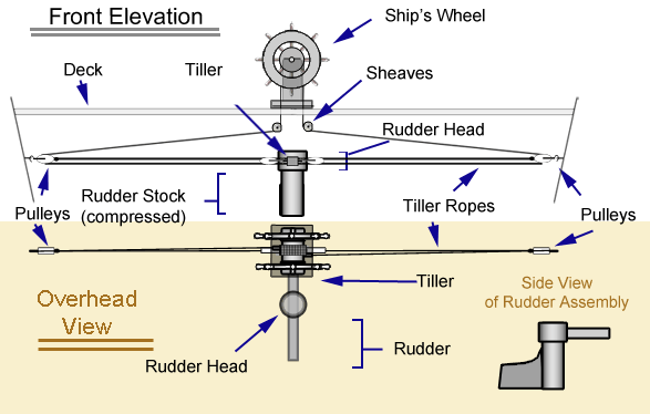 초기 선박의 조타 장치는 때때로 이중 바퀴로 구성되었는데, 각각의 바퀴는 나무로 된 '스핀들'로 연결되어 '배럴' 또는 '드럼'을 통과했다. 스핀들은 나무 '플랫폼'(종종 격자형) 위에 놓인 두 개의 '받침대'에 의해 지지되었다. '타일러 로프' 또는 '타일러 체인'(때로는 '조타 로프' 또는 '조타 체인'이라고도 함)은 배럴 주위를 5~6개의 루프로 감기고 플랫폼 상단의 두 개의 '타일러 로프/체인 슬롯'을 통해 아래로 내려가 갑판 바로 아래에 있는 두 개의 도르래(선박의 조타륜 양쪽에 하나씩)에 연결된 다음 도르래 쌍을 거쳐 타일러에서 다시 만나 선박의 방향타에 연결되었다.[3] 바퀴의 움직임(함께 연결되어 동시에 움직임)은 타일러 로프가 두 방향 중 하나로 감기게 하여 타일러를 좌우로 기울어지게 했다. 전형적이고 직관적인 배열에서, 정면을 향한 키잡이가 바퀴를 '반시계 방향'으로 돌리면 타일러가 우현으로 기울어지고 따라서 방향타가 좌현으로 꺾여 선박도 좌현으로 회전하게 된다.[3] 차축으로 연결된 두 개의 바퀴는 한 사람만으로는 선박의 움직임을 제어할 힘이 부족할 수 있는 악천후에서 두 사람이 조타를 잡을 수 있게 했다.최대 이동 범위에 도달하면 바퀴와 방향타가 "최대 각도"에 도달했다고 하며, 따라서 좌현/우현으로 "최대 좌현/우현" 명령이 선장/당직사관에 의해 내려진다.