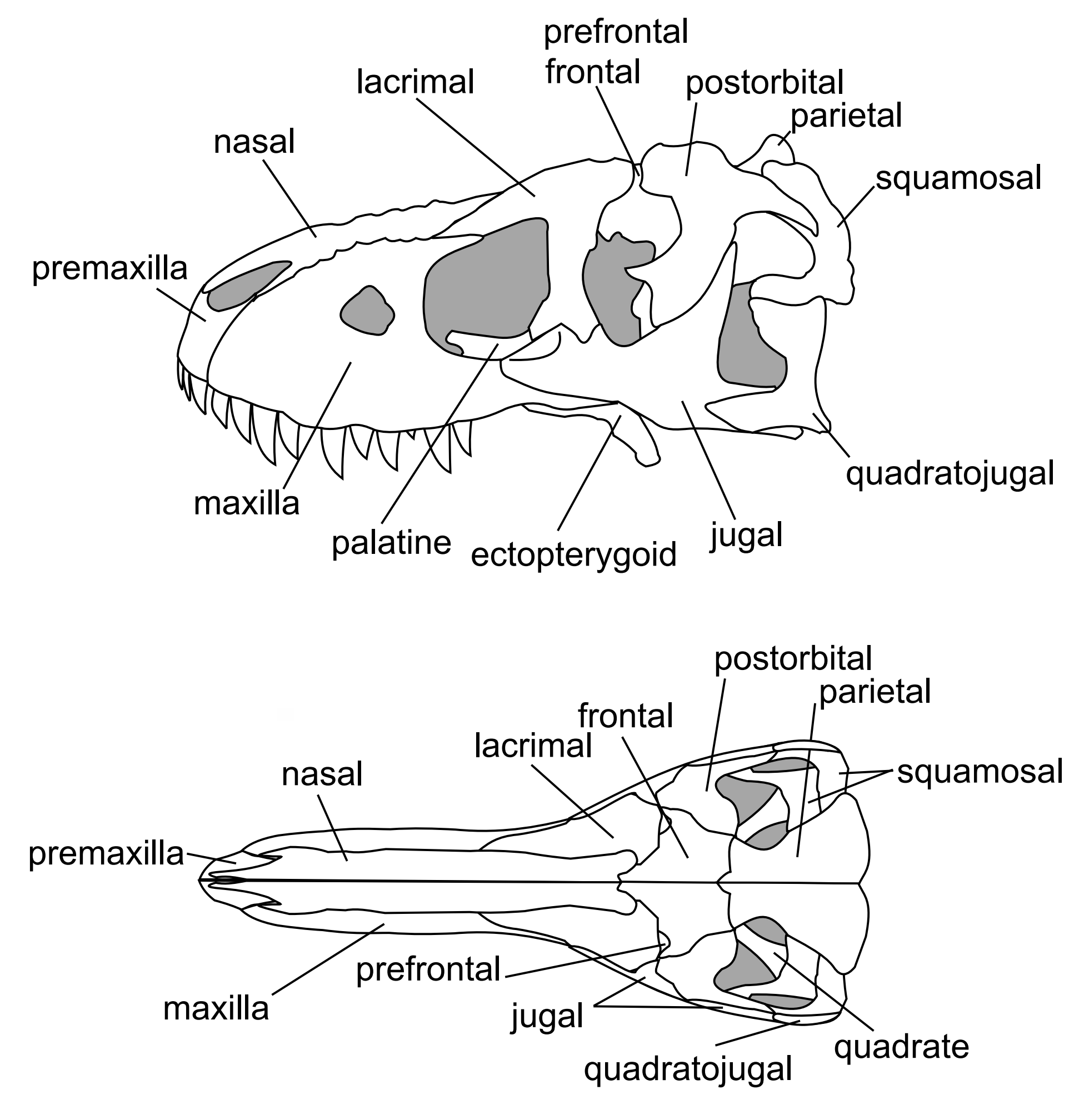 2003년에 ''타르보사우루스''의 두개골이 완전히 묘사되었다. 과학자들은 ''타르보사우루스''와 북아메리카의 티라노사우루스과 사이의 주요한 차이점을 언급했는데, 이러한 차이점 중 많은 부분은 물 때 두개골 뼈가 스트레스를 처리하는 방식과 관련이 있었다. 위턱이 물체에 닿으면 힘이 위턱의 주요 치아를 지지하는 뼈인 상악을 통해 주변 두개골 뼈로 전달되었다. 북아메리카 티라노사우루스과에서는 이 힘이 상악에서 코 앞부분 상단에 융합된 비골로 전달되었으며, 비골은 뒤쪽에서 뼈 지지대에 의해 눈물뼈에 단단히 연결되어 있었다. 이 지지대는 두 뼈를 함께 고정하여 힘이 비골에서 눈물뼈로 전달되었음을 시사한다.[40]