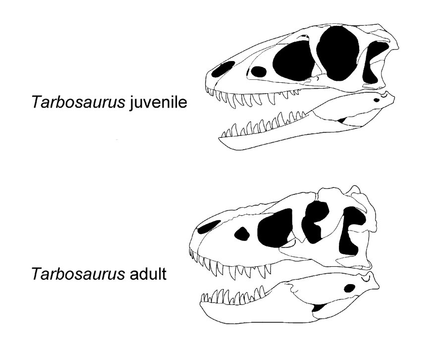 대부분의 '''타르보사우루스''' 표본은 성체 또는 아성체 개체를 나타내며, 어린 개체는 매우 드물다. 2006년에 290mm 길이의 완전한 두개골을 가진 어린 개체(MPC-D 107/7)가 발견되어 2011년에 보고 및 기술되었으며, 이 공룡의 생애사에 대한 정보를 제공했다. 이 개체는 사망 당시 아마도 2~3세였을 것이다. 성체 두개골과 비교했을 때, 어린 개체의 두개골은 약하게 구성되었고 이빨은 얇았는데, 이는 어린 개체와 성체가 다른 먹이 선호도를 가지고 있어 연령대 간의 경쟁을 줄였음을 나타낸다. 이 어린 '''타르보사우루스'''의 공막륜을 검사한 결과, 이들이 박명박모성 또는 야행성 사냥꾼이었을 수도 있음을 시사한다. 성체 '''타르보사우루스'''도 야행성이었는지 여부는 현재 화석 증거가 부족하여 알려져 있지 않다.[51] 전두골에서 확인된 발생학적 변화는 '''타르보사우루스'''의 비대칭 성장이 북아메리카 티라노사우루스과와 유사했음을 시사한다.[52]