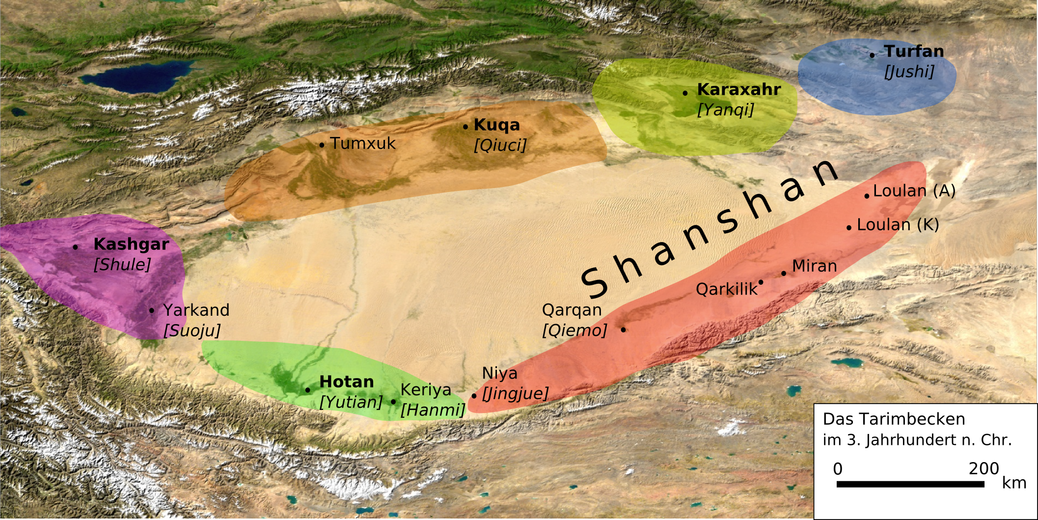사마천의 『사기』에 따르면, 월지는 흉노에 의해 서쪽으로 밀려났고, 일부는 파미르 고원으로 피신 후 동쪽으로 돌아와 타림 분지에 정착했다. 기원전 200년경, 월지는 흉노에게 압도당했고, 한나라는 한-흉노 전쟁을 통해 타림 분지를 서역도호부로 통치했다.