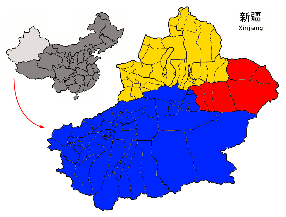 신장 위구르 자치구는 지리적, 역사적, 민족적으로 준가리아와 타림 분지(알티샤르)로 나뉘며, 1884년 청나라에 의해 하나의 성으로 통합되었다.[3] 청나라 정복 당시 준가리아에는 몽골어를 사용하는 티베트 불교 신자 준가르인들이 유목 생활을 하고 있었고,[4] 타림 분지에는 튀르크어를 사용하는 위구르족 무슬림 농민들이 오아시스에 정착하여 농업을 하고 있었다.[5] 이 두 지역은 1884년 신장 성이 설립될 때까지 별도로 통치되었다.