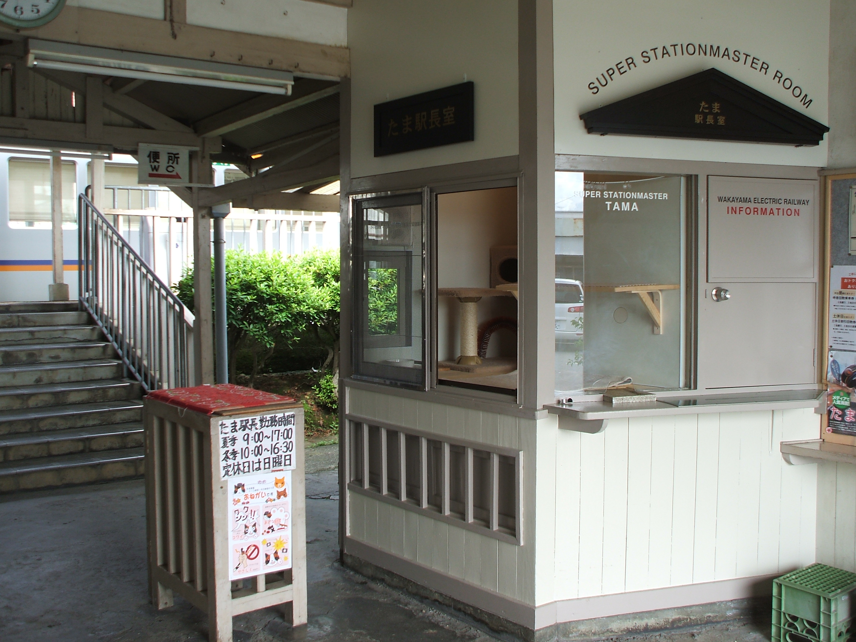 이 경영 이관에 따라, 노선과 역의 부지는 난카이의 사유지에서 키시가와정 (현재의 기노카와시)의 공유지가 되었고, 창고는 철거하여 자전거 주차장으로, 창고와 역사의 사이는 승강장으로 가는 공도로 정비되게 되어, 거기에 놓여 있던 타마 일행의 고양이 집은 철거를 요구받게 되었다。곤란해진 주인이 2006년 4월 1일에 와카야마 전철의 개업 기념식을 마친 후의 코지마 미츠노부 사장 (료비 그룹 대표와 겸무)에게 "고양이들을 역 안에 살게 해줄 수 없을까"라고 상담했다. 코지마는 집에서 오랫동안 기슈견을 기르고 있어서 고양이보다는 오히려 개를 좋아했지만, 이때 "타마와 눈이 마주친 순간, 반짝 하고 타마의 역장 모습이 머리에 떠올랐습니다"[31]"정말로 훌륭하고, 반짝였습니다. 지금의 일본인에게도 없는 눈이라고", "신이 보낸 철도의 구세주"[32]라고, 타마에게 반한 코지마의 발안으로, "마네키네코"가 되어 주기를 바라며, 그 이전부터 역 이용자들에게 친숙했던 타마 일행을 역장 등으로 임명하게 되었다[33]。이는 와카야마 전철 이관 후에 합리화를 위해 키시역을 무인역으로 한 것도 배경에 있다. 고양이에게 역장을 촉탁으로 임명한 예는 일본의 민영 철도에서는 처음이다[34]。
