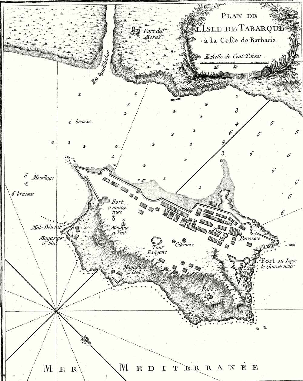 1540년부터 1742년까지 제노바인들은 도시에서 약 약 333.76m 떨어진 인접한 섬인 타바르카에 주둔했다. 1540년, 튀니스의 오스만 베이는 산호 어업에 관심이 있던 황제 카를 5세의 요청에 따라, 1553년 제노바인들이 스페인에 봉사하면서 이 섬을 제노바의 로멜리니 가문에 양도했다.[9] 로멜리니 가문은 제노바의 도제였던 안드레아 도리아의 측근이었으며 그리말디 가문과 관련이 있었다. 이 양도는 1540년 안드레아 도리아의 조카인 지안네티노 도리아에게 포획된 해적 튀르크인 드라구트의 석방을 위한 비밀 몸값 때문이었을 가능성이 있다. 로멜리니 가문은 제노바 근처 페글리 주민들을 데리고 타바르카를 식민지화했다.[10]