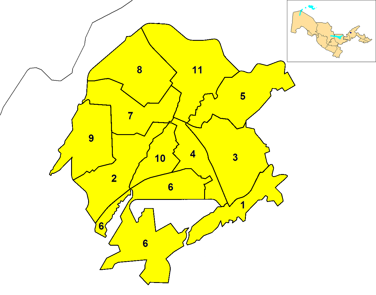 우즈베키스탄은 우즈베크어 이름을 사용하는 12개의 주, 특별시 타슈켄트, 자치 공화국인 카라칼파크스탄 공화국으로 구성된 행정 구역이며, 각 지역은 175개의 구로 나뉜다. - 강거 - 탈라스 전투