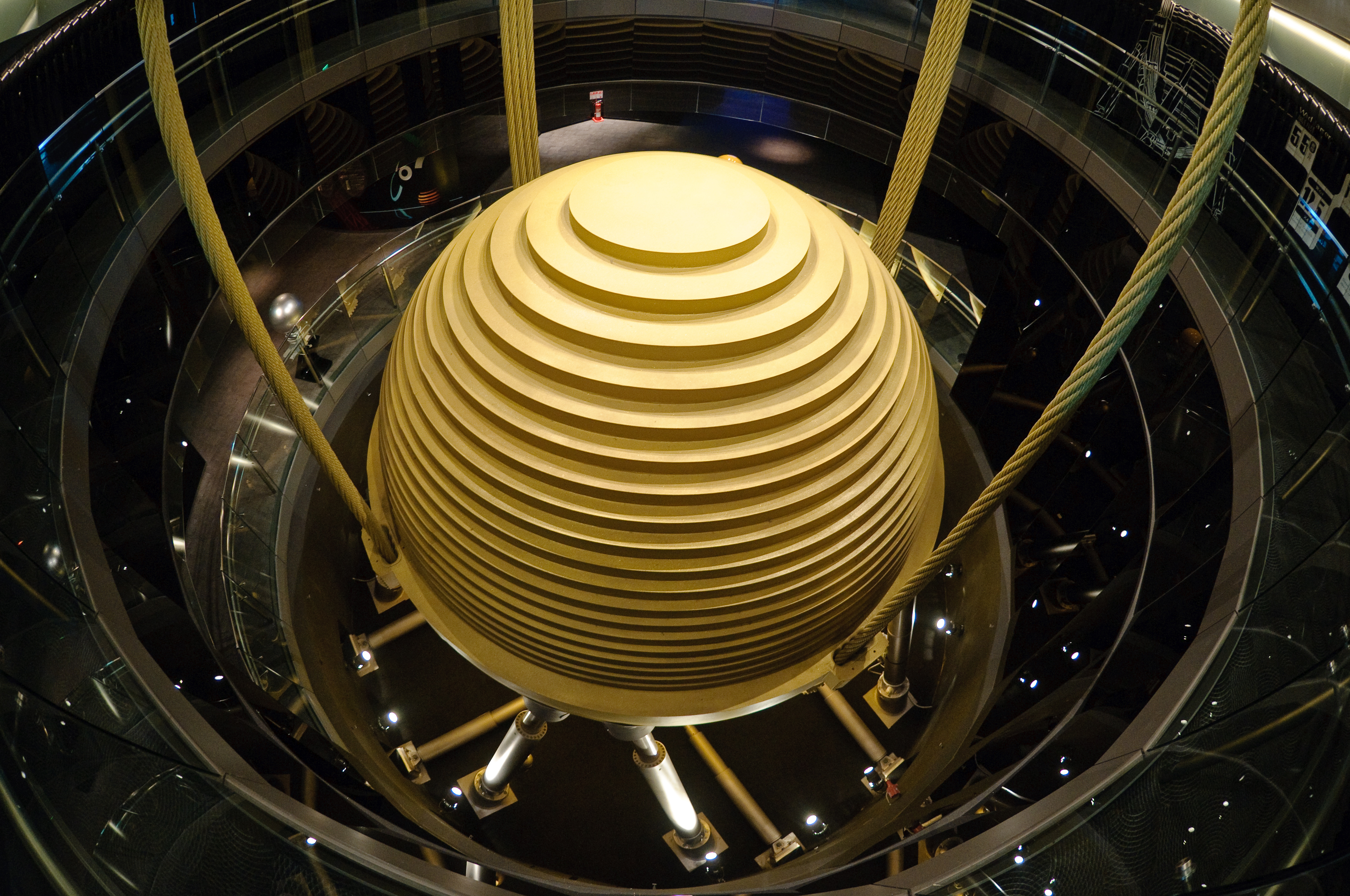 바람에 의한 진동을 완화하기 위해 88층에서 92층 사이에 660ton 무게의 동조 질량 댐퍼(TMD)가 설치되어 있다. 이 댐퍼는 강한 돌풍으로 인한 건물의 움직임을 상쇄하기 위해 흔들리며, 타워의 움직임을 최대 40%까지 줄일 수 있다.[57] 댐퍼는 직경 5.5m의 강철 공 형태로, 41개의 강철판을 용접하여 만들었다.[58] 2015년 8월 8일 태풍 사우델로르의 강풍으로 인해 댐퍼가 1m나 흔들렸는데, 이는 댐퍼가 기록한 가장 큰 움직임이었다.[59][60]