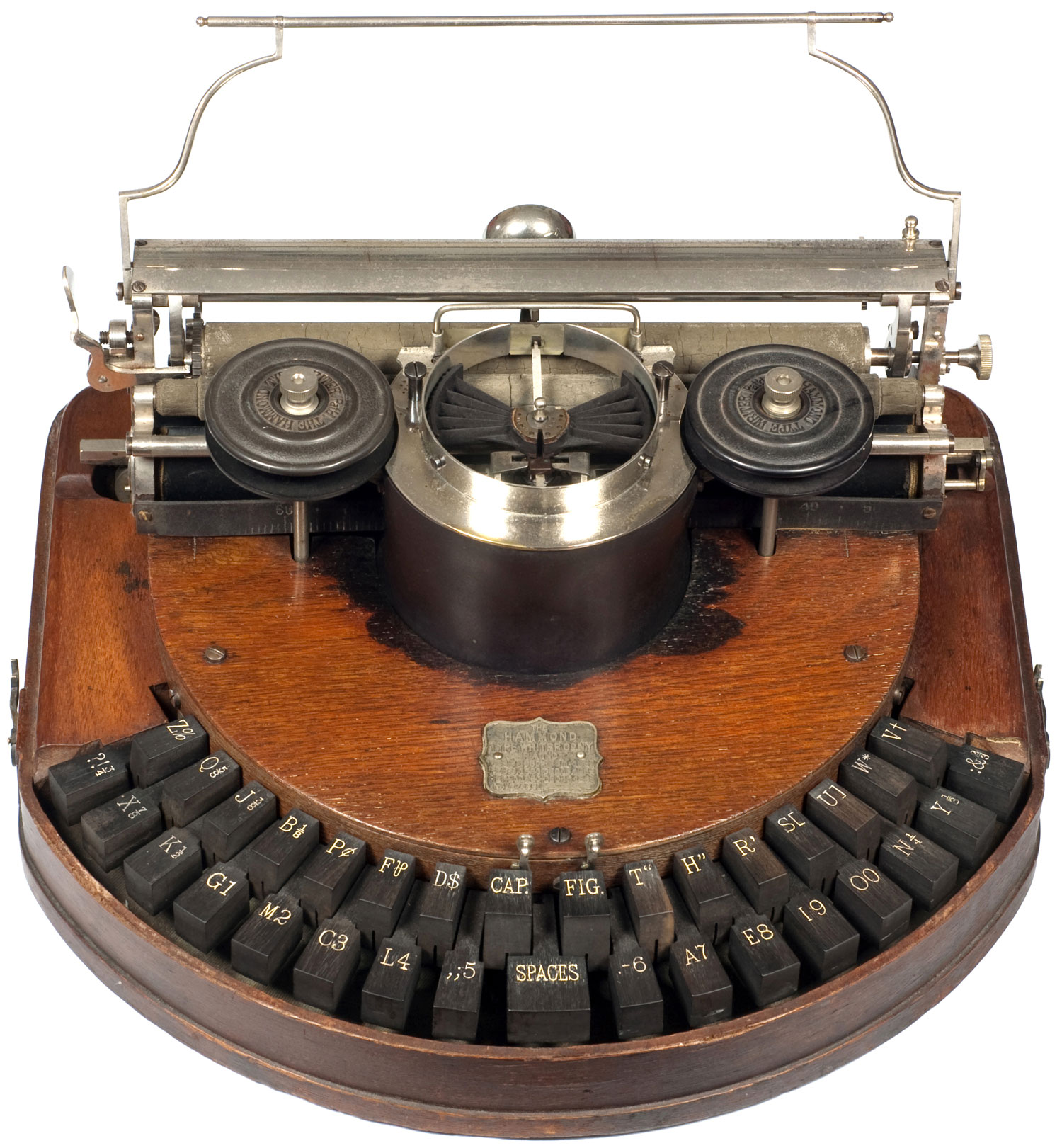 1884년 | 제임스 해먼드 | 해먼드 "아이디얼" 타자기 | 우수한 인쇄 품질과 교체 가능한 활자체로 인해 인기를 얻음. 활자는 교체 가능한 회전하는 한 쌍의 섹터에 의해 운반되며, 작은 해머가 종이를 리본과 활자 섹터에 밀어 각 문자를 인쇄한다.[41] |