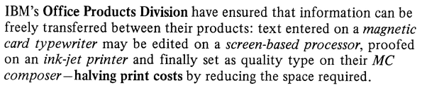 1941년, IBM은 획기적인 개념인 비례 간격을 특징으로 하는 일렉트로매틱 모델 04 전기 타자기를 발표했다. 이 타자기는 크기가 다른 문자에 다양한 간격을 할당하여 조판된 페이지의 모양을 재현했으며, 1937년에 도입된 탄소 필름 리본을 사용하여 페이지에 더 선명하고 뚜렷한 단어를 생성함으로써 더욱 향상되었다.[76]