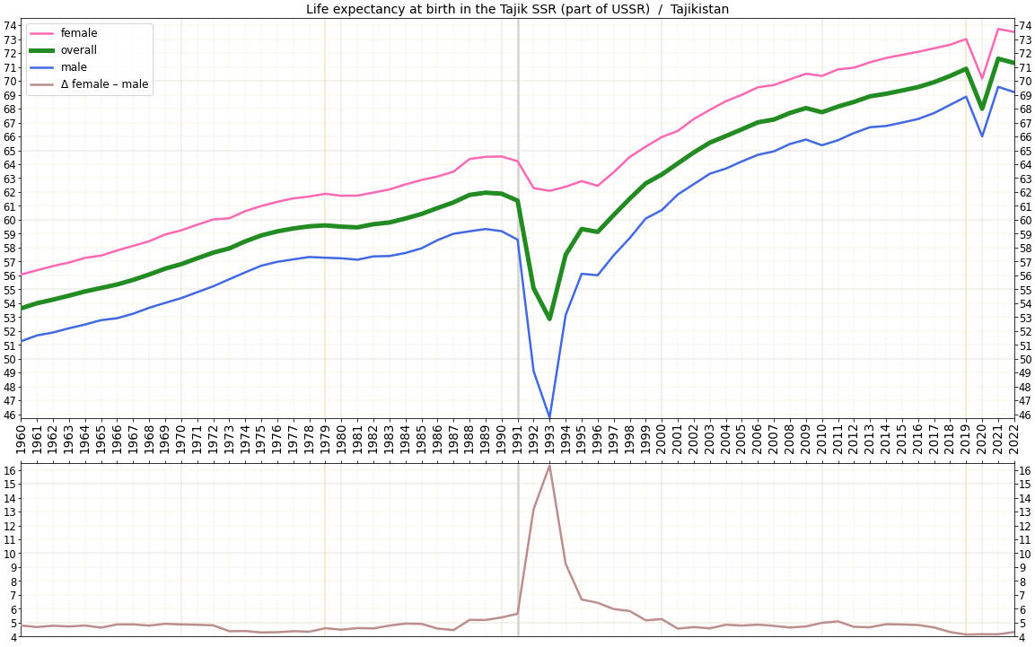 [30][31][32]1950년부터 현재까지 타지키스탄의 출생 및 사망 통계는 다음과 같다. 특히 1992년과 1993년 타지키스탄 내전 시기에는 출생률이 급감하고 사망률이 급증하는 등 인구 구조에 큰 변화가 있었다. 이후 점차 회복되는 추세를 보였다.