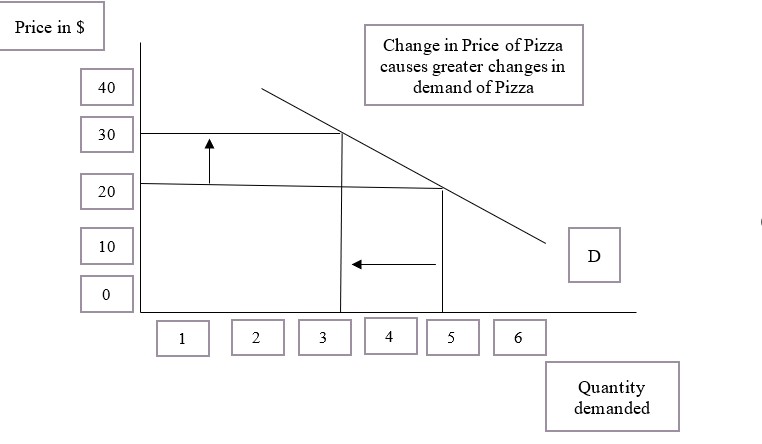 예를 들어, 위 그래프에서 피자 가격이 20달러일 때 수요량이 5개였지만, 가격이 30달러로 오르자 수요량이 3개로 줄었다. 이는 가격 변화가 수요량에 큰 영향을 미친다는 것을 보여준다.