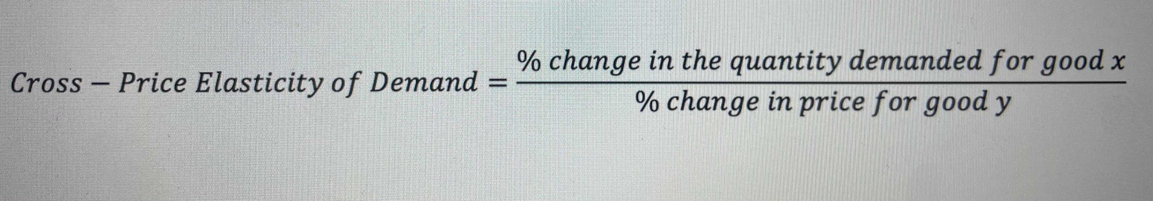 교차 탄력성(또는 교차 수요의 탄력성)은 다른 상품의 가격 변화에 따른 한 상품의 수요량 변화 간의 민감도를 측정한다.[17] 수요의 가격 탄력성과 유사한 공식을 따르며, 첫 번째 상품의 수량 변화율을 두 번째 상품의 가격 변화율로 나누어 계산한다.[17] 민감도 결정에 사용될 수 있는 관련 상품은 보완재 또는 대체재일 수 있다.[11] 상품 간의 높은 교차 가격 탄력성은 대체재일 가능성이 높고 유사한 특성을 가질 수 있음을 나타낸다.[18] 교차 가격 탄력성이 음수이면 해당 상품은 보완재일 가능성이 높다.