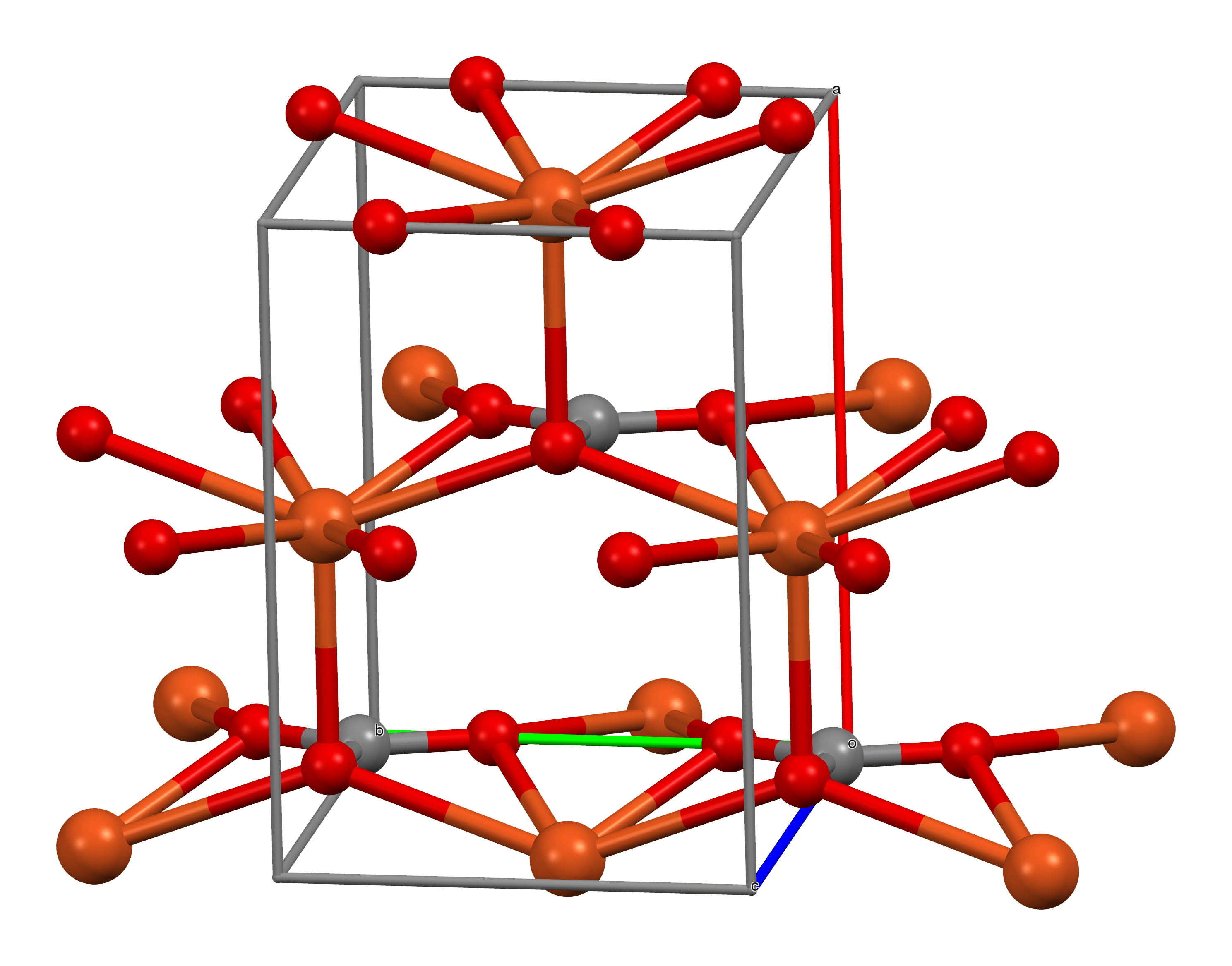 CuCO3의 결정 구조에서 구리는 왜곡된 사각뿔 분자 구조의 배위 환경을 가지며, 배위수는 5이다.[4] 각 탄산염 이온은 5개의 구리 중심과 결합한다.[4]참조