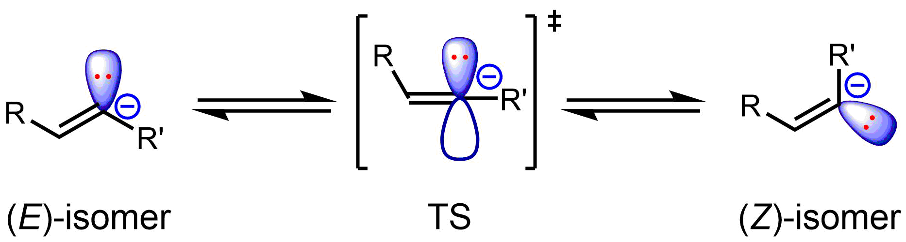 비닐 음이온은 굽은형이다. 1,2-이치환된 비닐 음이온은 선형 전이 상태를 통해 반전되는 ''E'' 및 ''Z'' 이성질체를 갖는다.