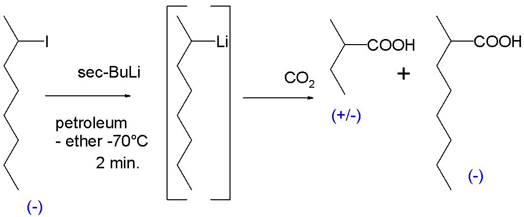 키랄 유기리튬 화합물의 존재에 대한 최초의 증거는 1950년에 얻어졌다. 키랄 2-아이오도옥탄을 ''s''-부틸리튬과 석유 에테르에서 -70°C에서 반응시킨 후 드라이 아이스와 반응시키면 대부분 라세미체인 2-메틸뷰티르산이 생성되었지만, 광학 활성 2-메틸옥탄산도 생성되었는데, 이는 리튬에 연결된 탄소 원자가 탄소 음이온인 광학 활성 2-메틸헵틸리튬으로부터만 형성될 수 있었다.[22]